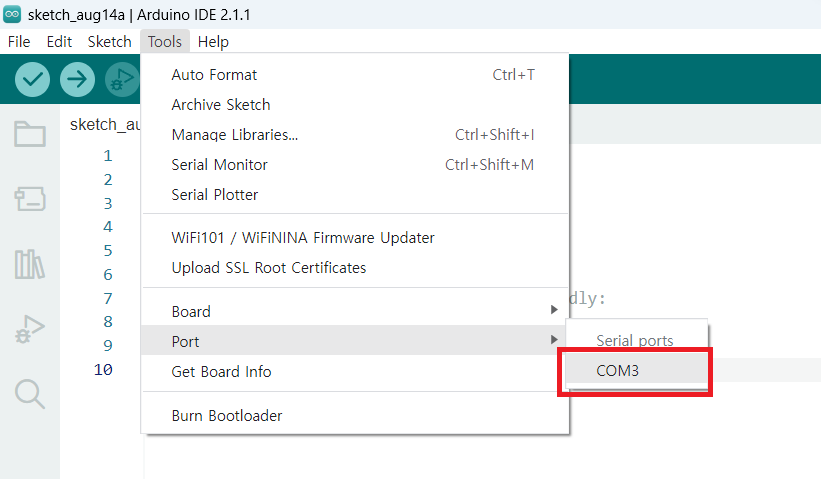 아두이노 IDE에서 COM3를 선택해줍니다.