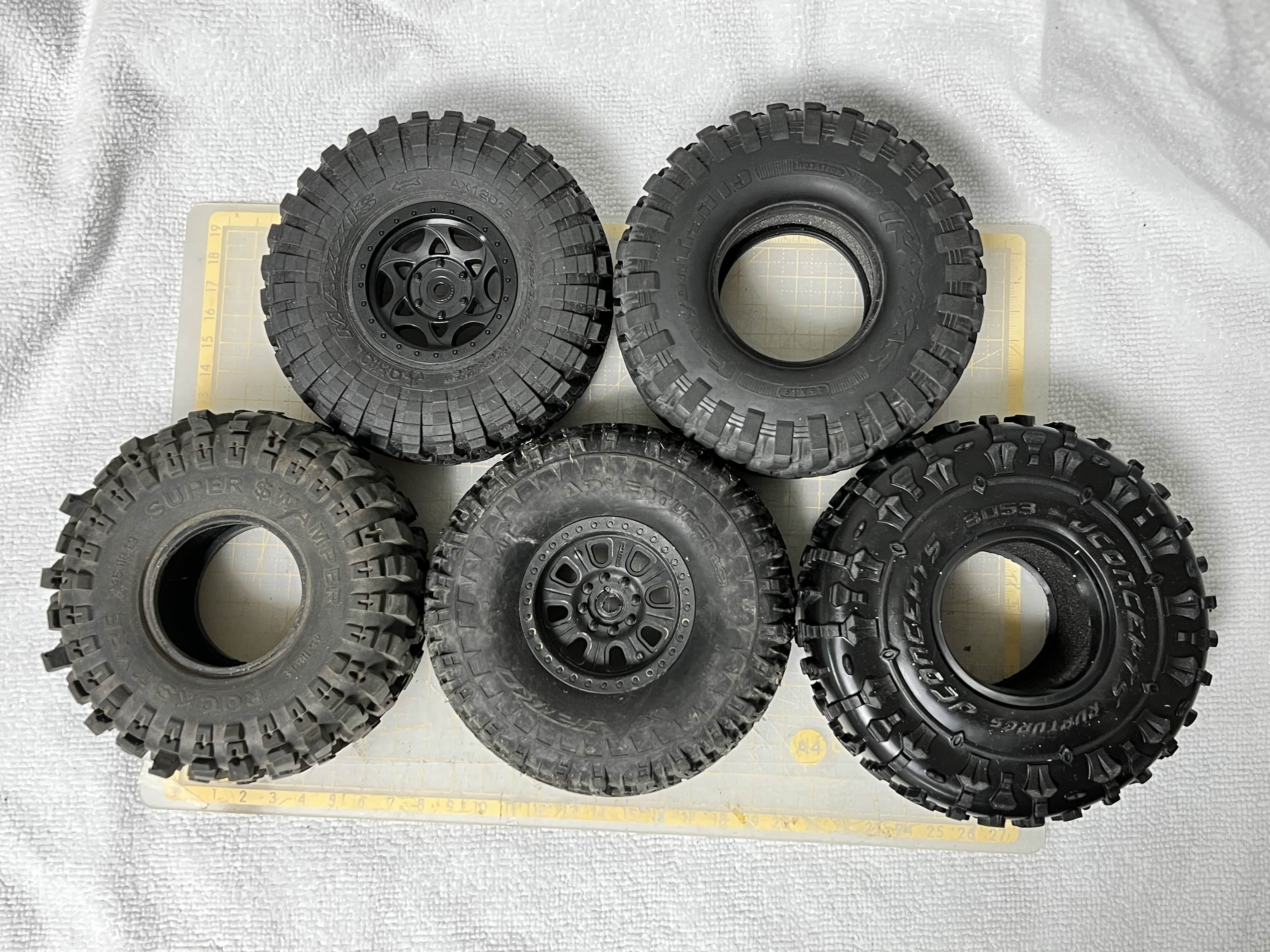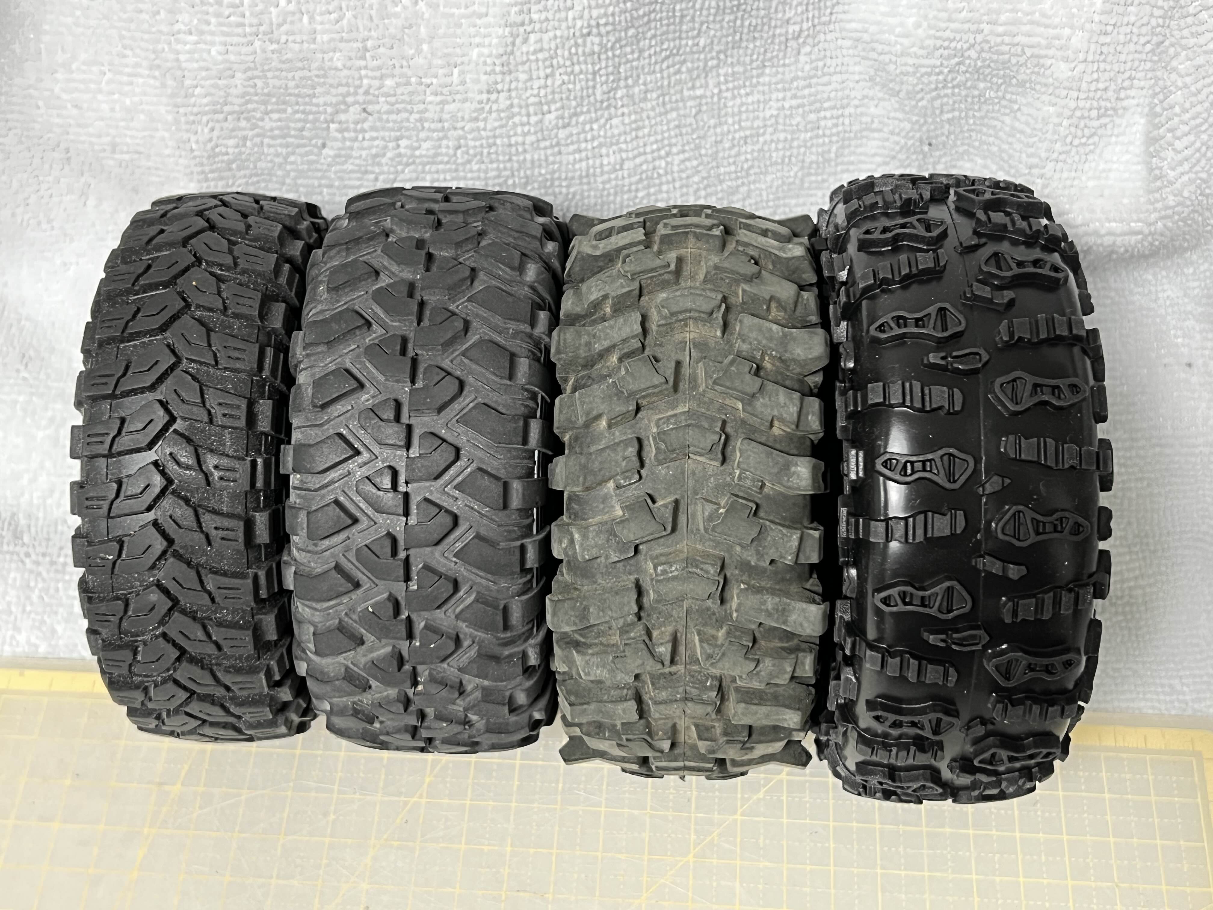 좌측부터 엑시얼 순정타이어(MAXXIS) - 트랙사스 순정타이어 - 알리발 타이어 - 럽처 타이어