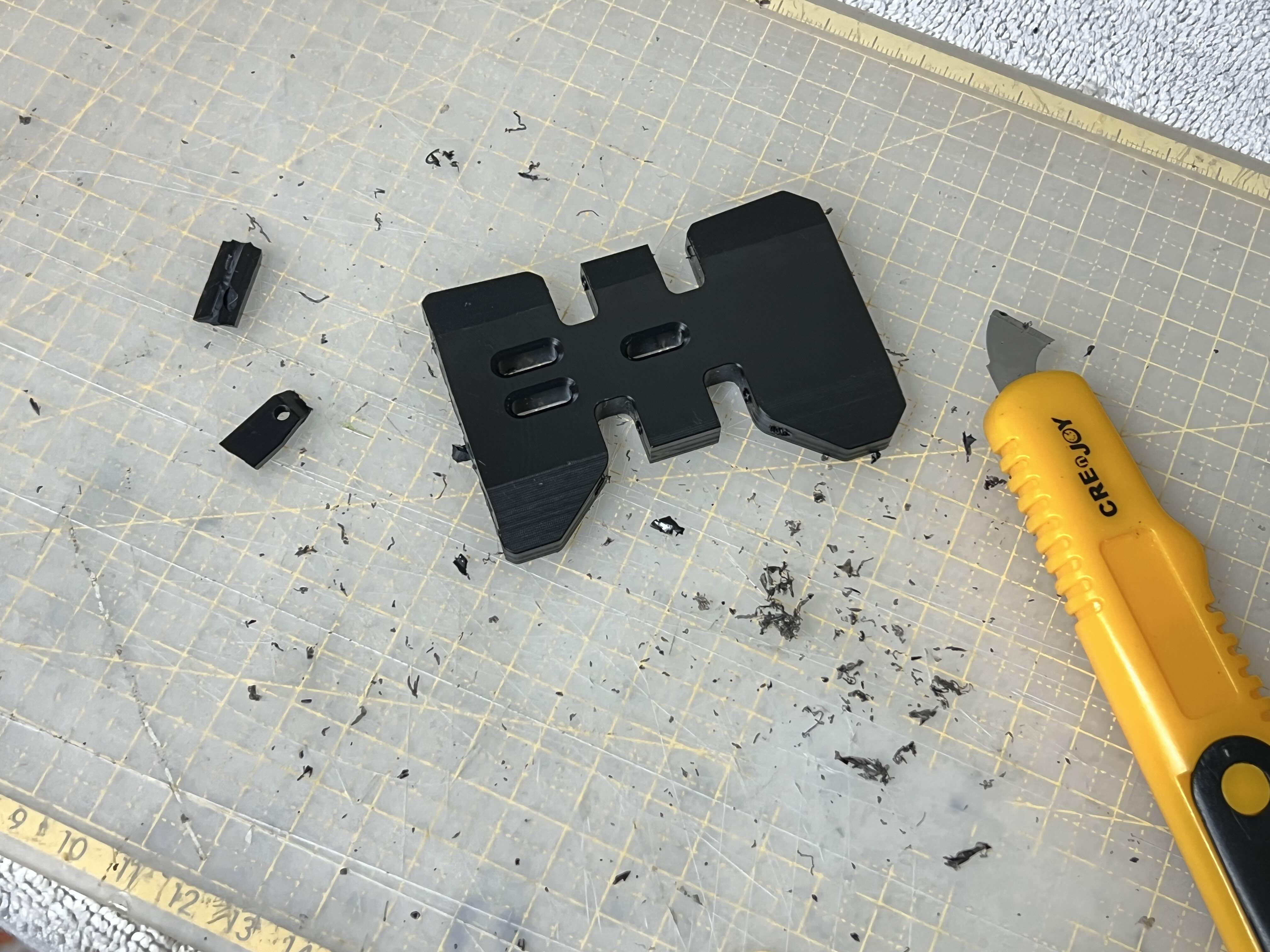다행히 플레이트의 재질이 쉽게 개지는 플라스틱이 아닌 충격에도 견고한 딱딱한 고무(?)재질이라 아크릴 컷팅칼로 슥슥 그어주고 니퍼로 꺽어주니 원하는 모양대로 똑 부러져주었습니다.