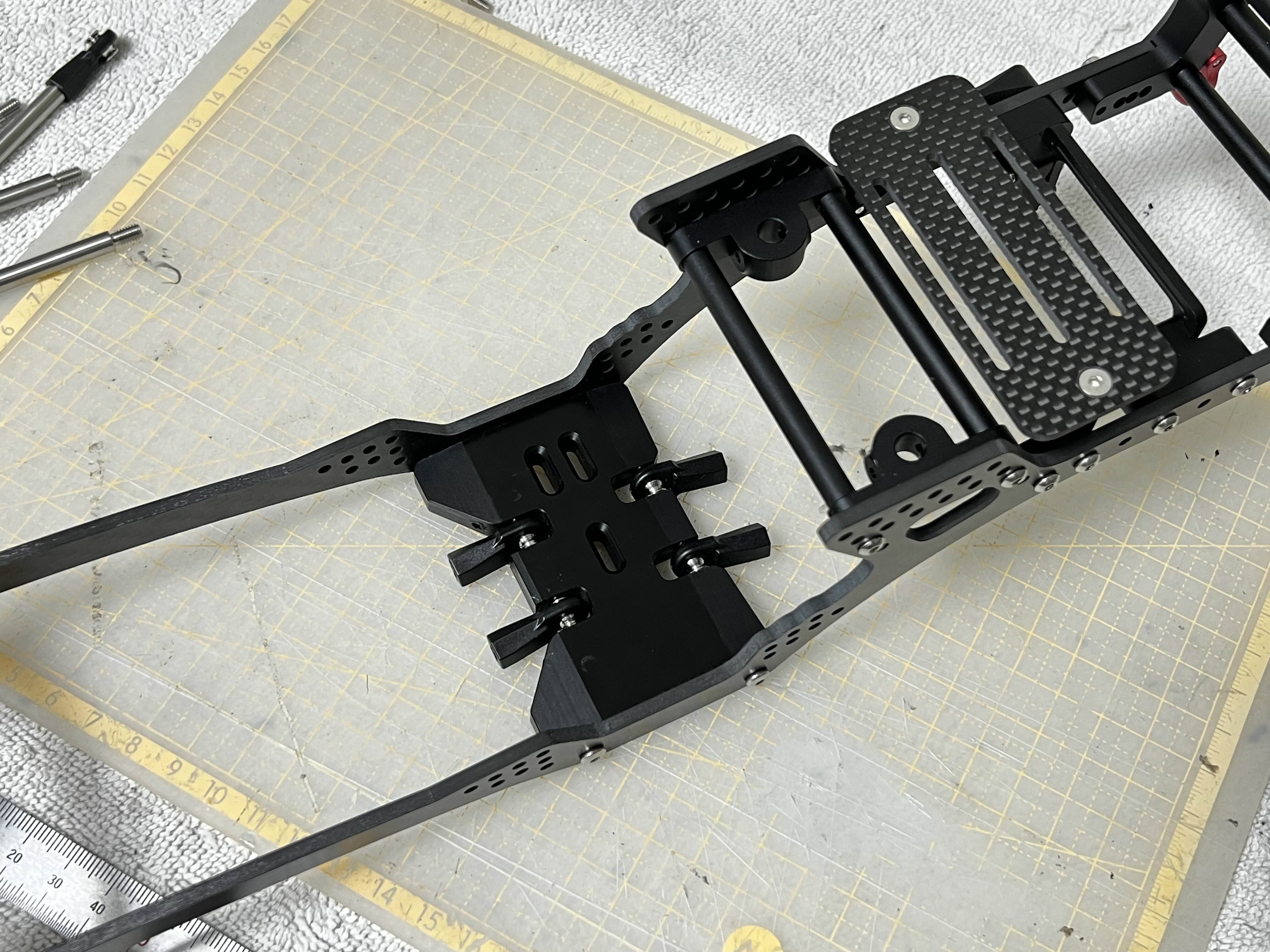 샷시와 스키드 플레이트 사이에 3mm 스페이서를 끼워서 사이즈를 벌려 연결하기로 합니다.