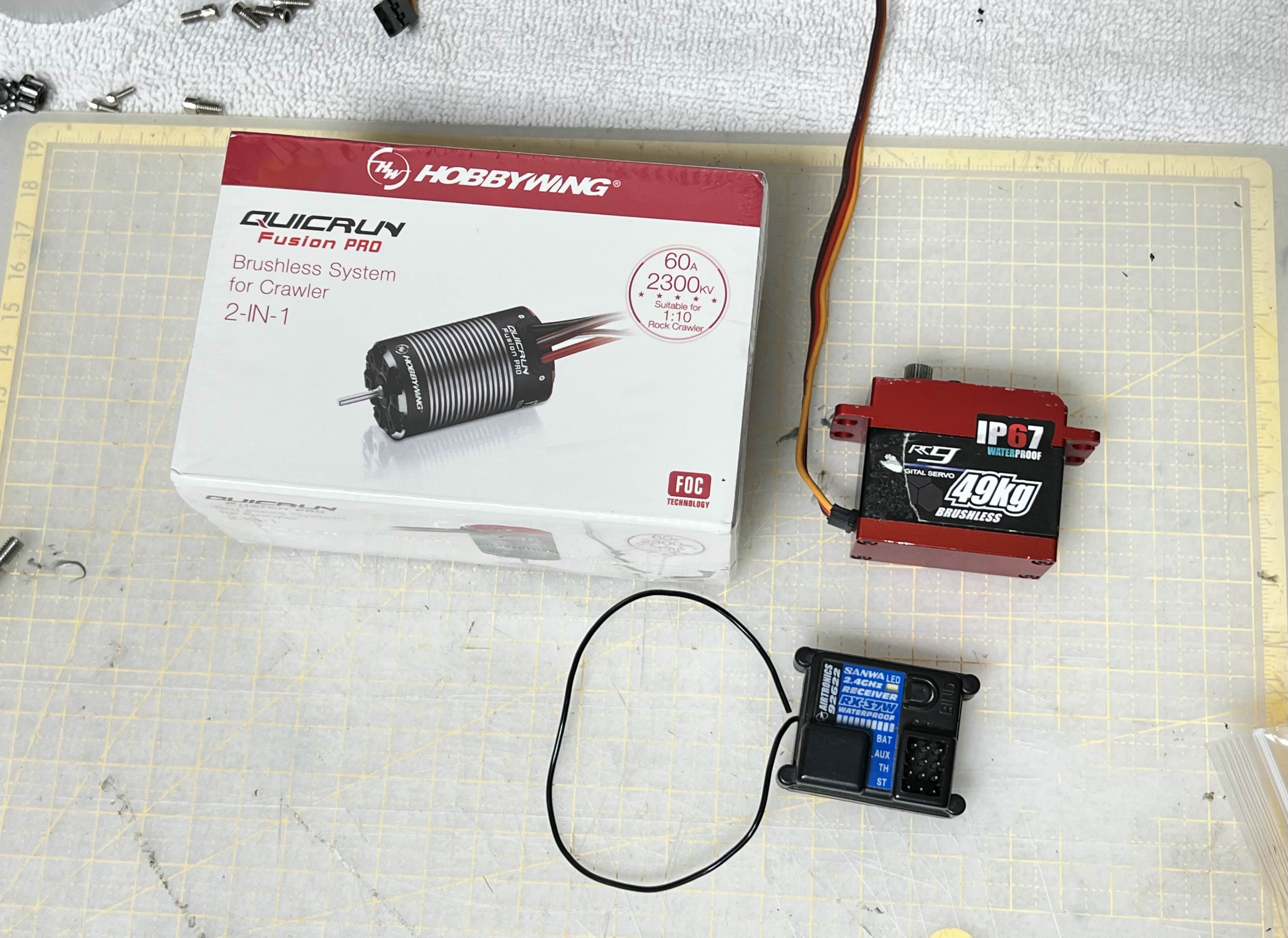 새로이 구매한 하비윙 퀵런 퓨전 프로 (2300kv), RC9 49kg 서보, 산와 RX-37W 수신기를 꺼내봅니다.