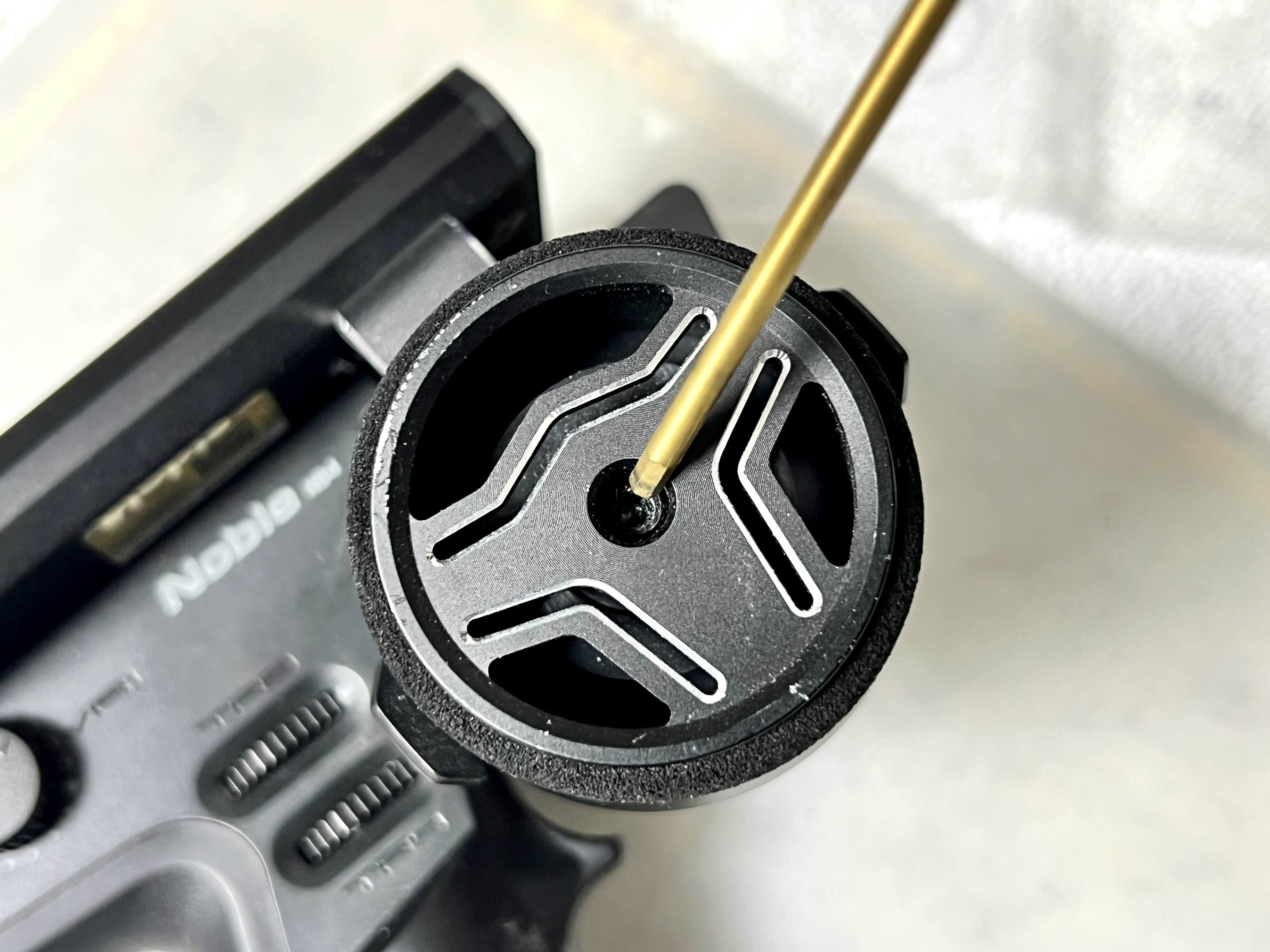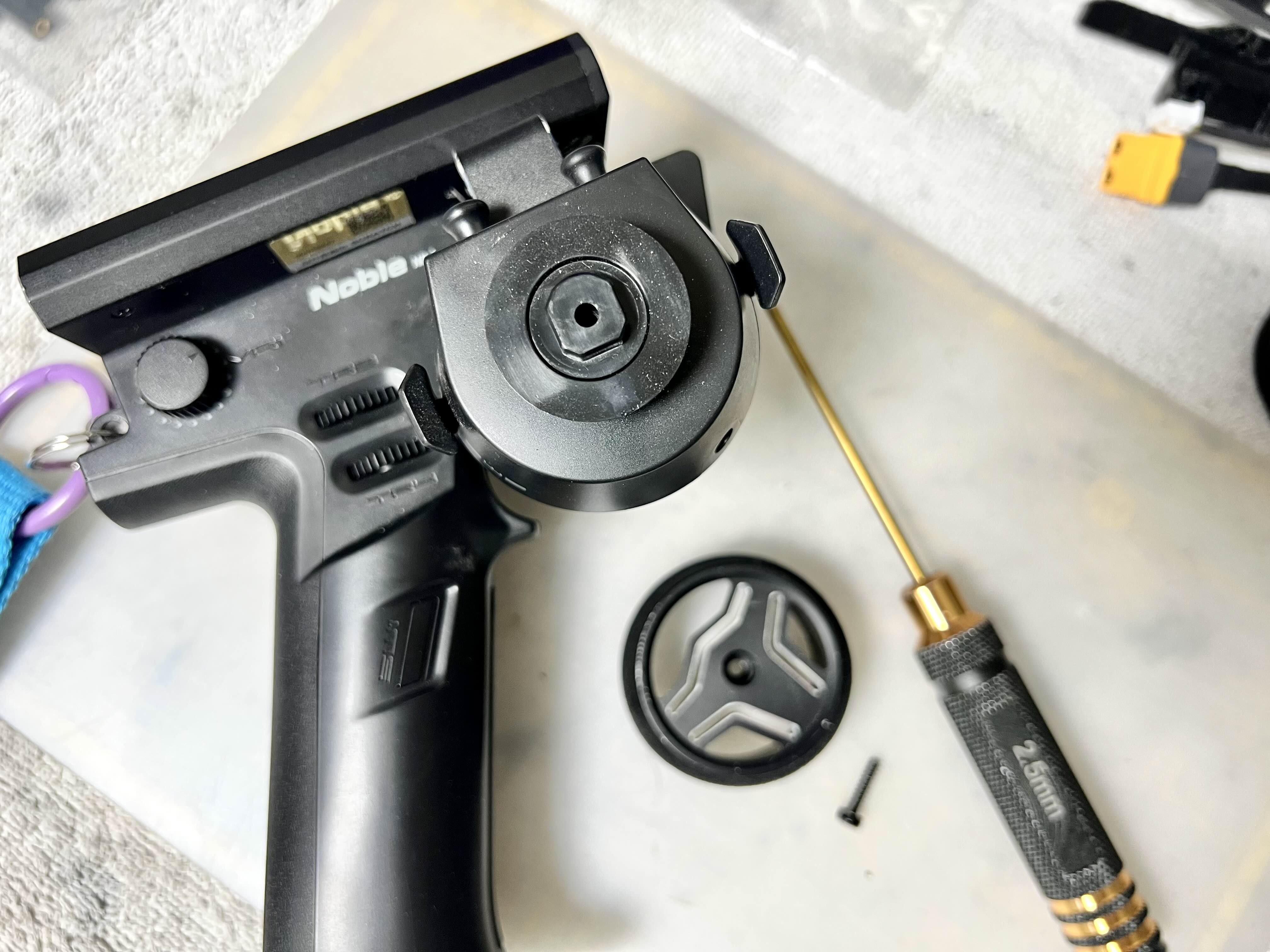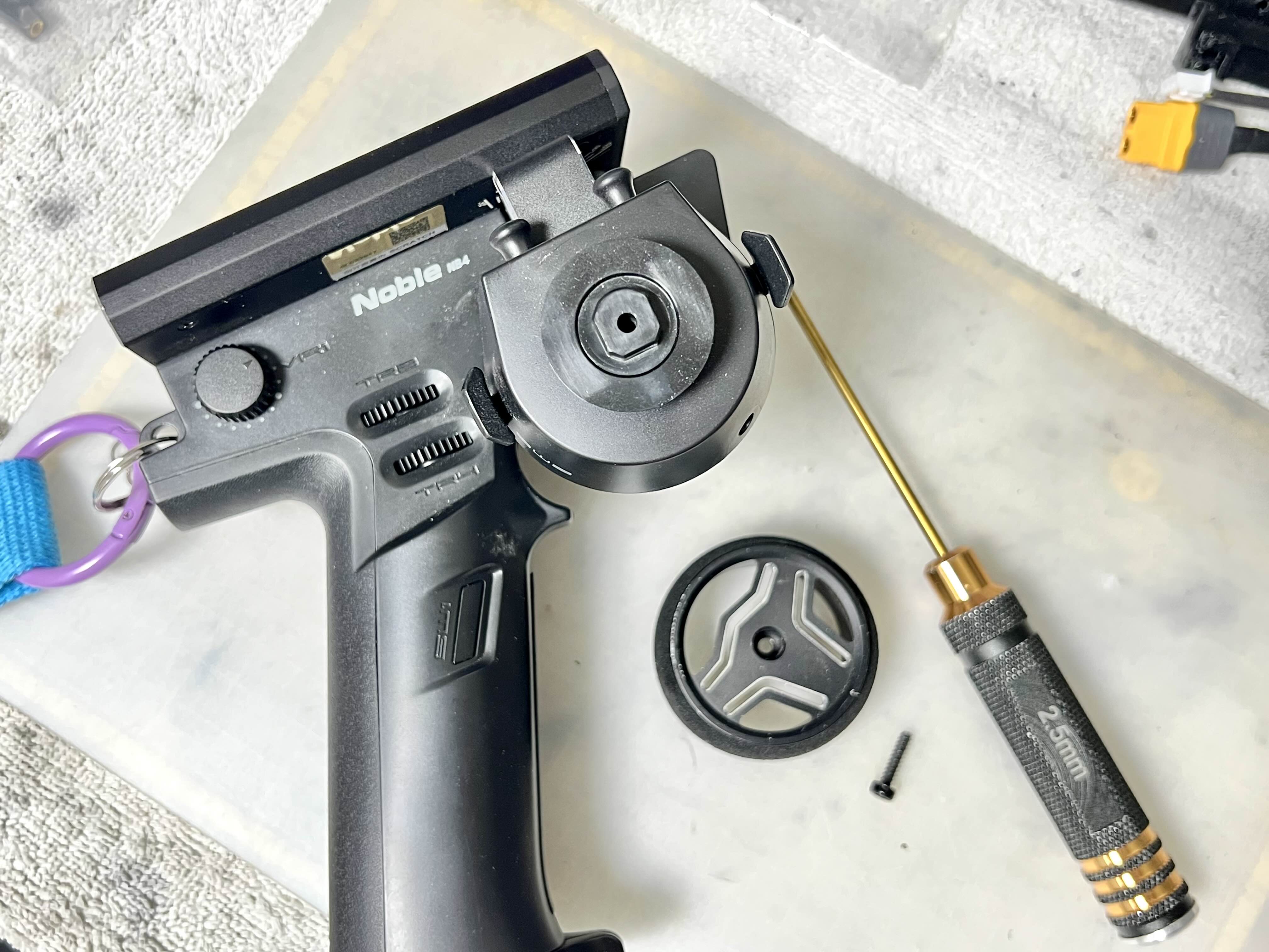 조종기 노블 NB4를 가져와서 순정 휠 가운데 있는 육각 나사를 풀어줍니다.