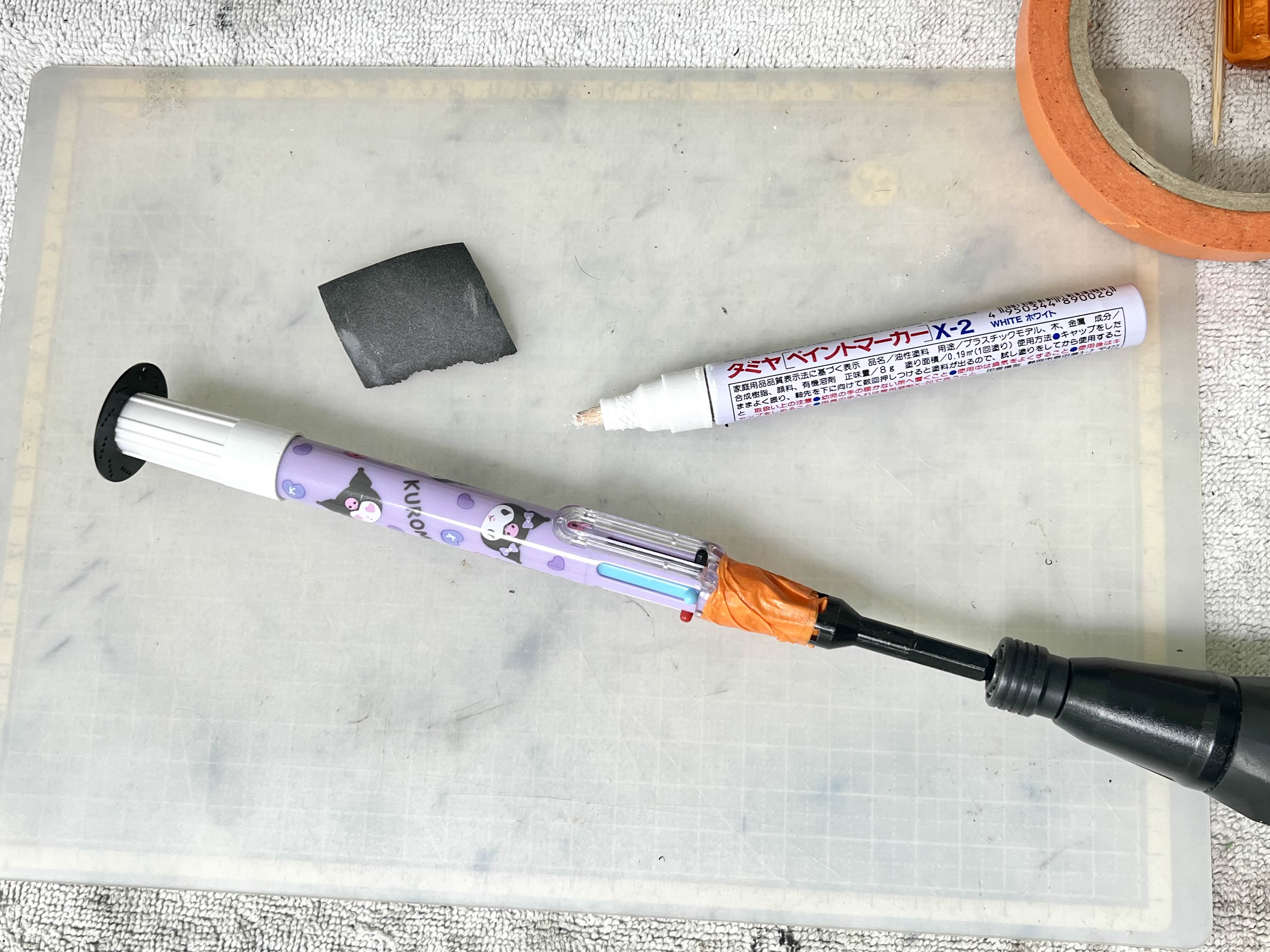 뚜껑 구멍에 맞는 볼펜을 찾고 끼운뒤 트라이얼 제작시 사용하던 볼조인트 렌치 공구를 꺼내 테잎으로 단단히 고정시키고, 다시 그걸 전동드릴에 연결해서 회전체를 만들었습니다.