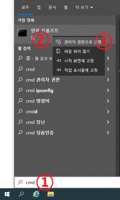 ① 윈도우 시작버튼을 클릭해서 cmd를 입력