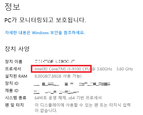 프로세서 부분이 자신이 사용중인 PC의 CPU인것이다!
